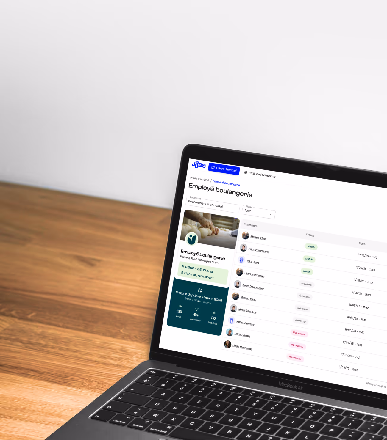 Comme Bejobs effectue un matching en temps réel et que les employeurs reçoivent immédiatement des notifications, vous recevez souvent une première réponse en quelques jours seulement. Vous pouvez suivre le statut de chacun dans votre tableau de bord.